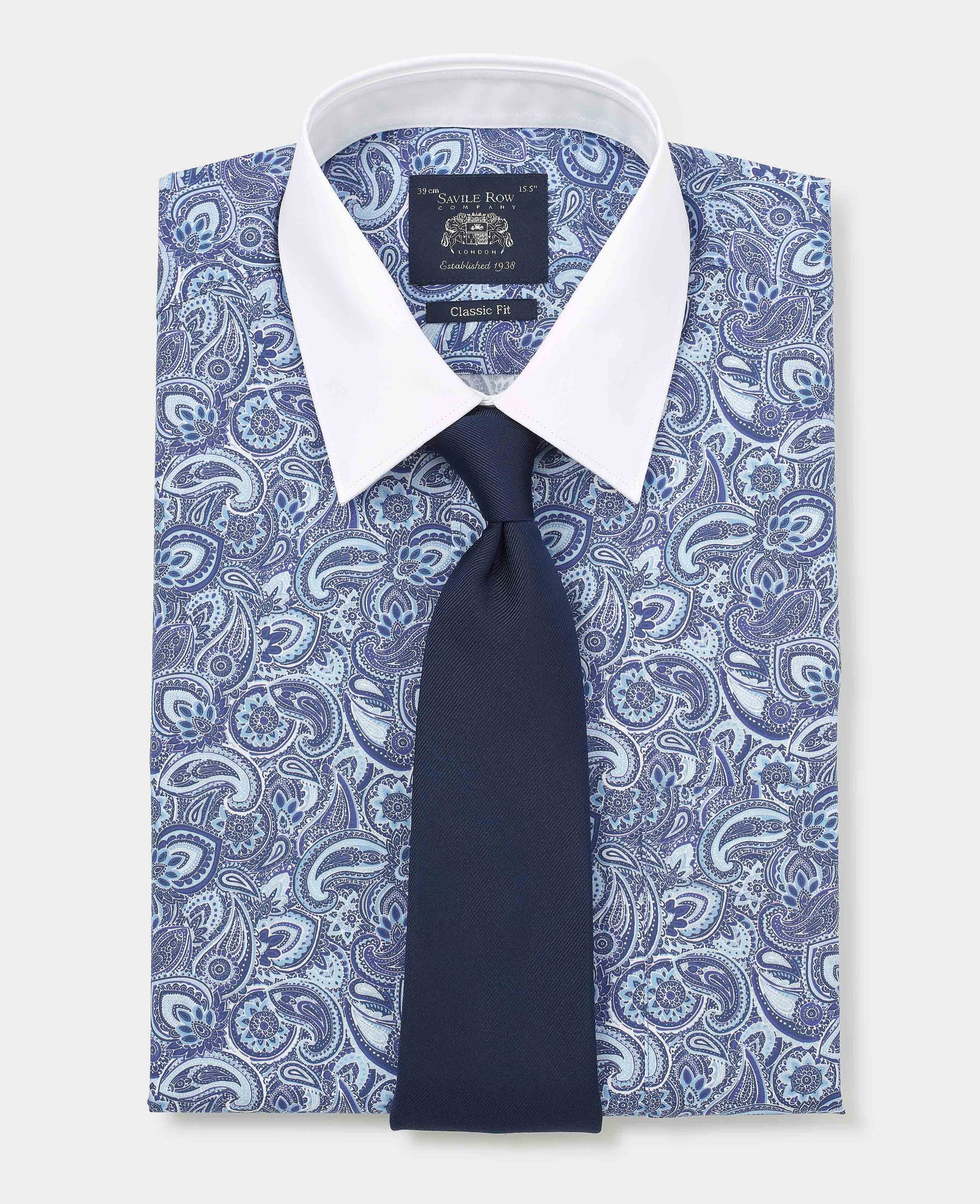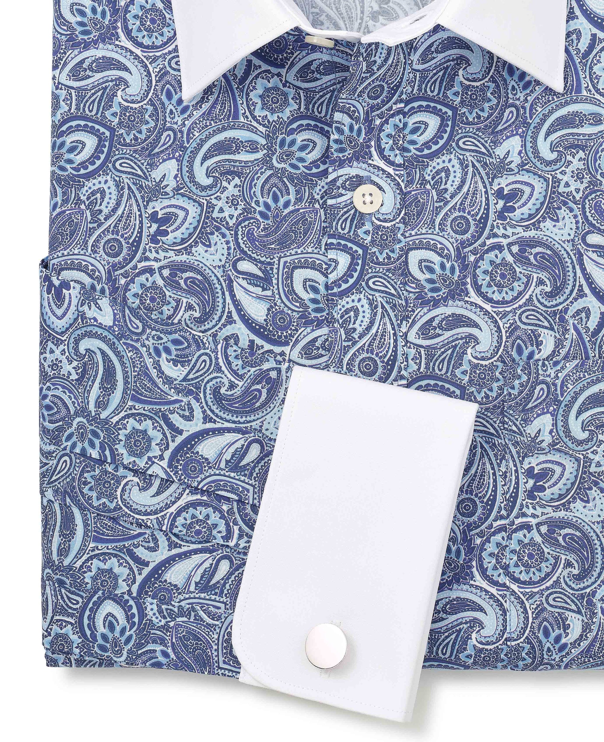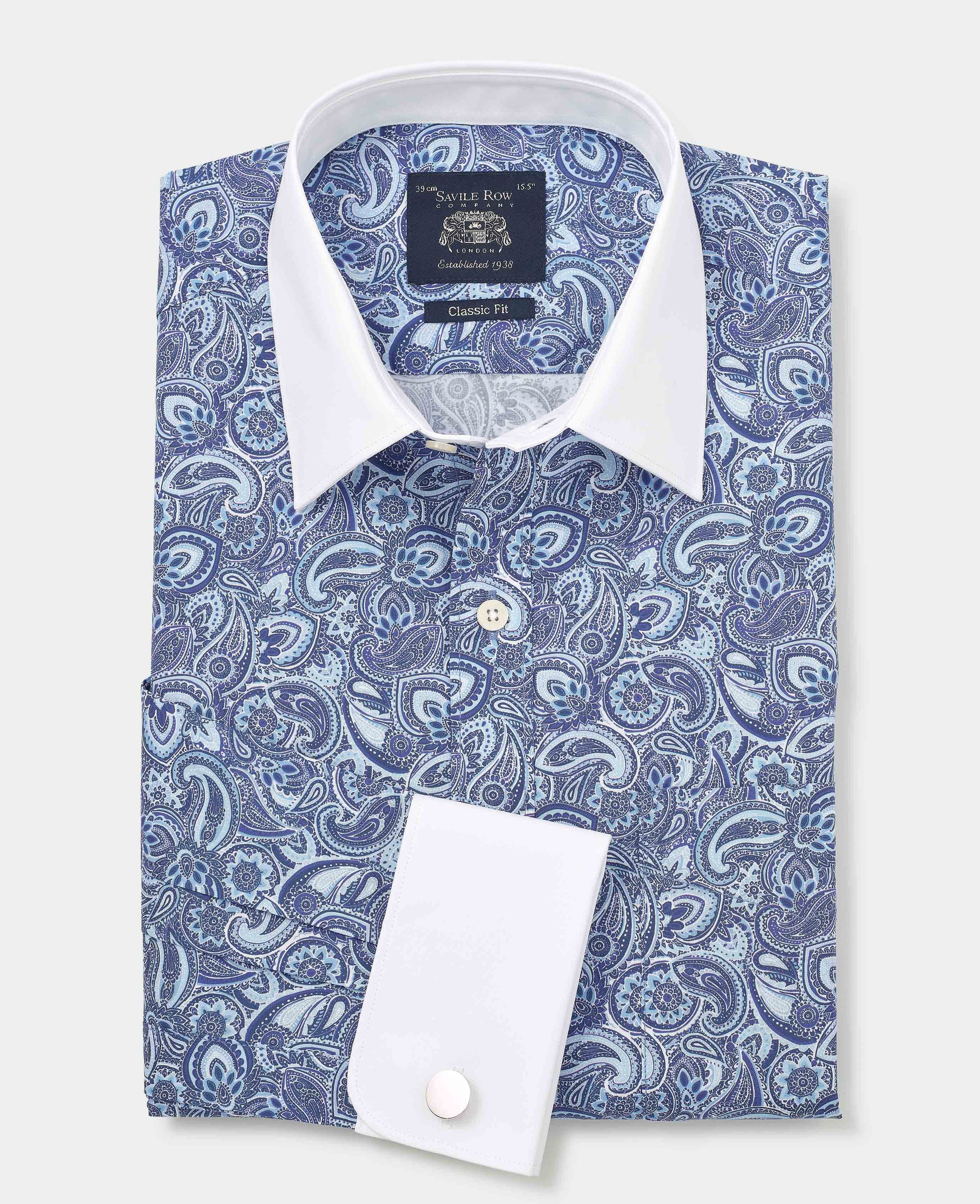 Make a bold statement with this blue paisley print Winchester dress shirt, a distinctive choice for those who appreciate refined style with a touch of flair. The intricate paisley pattern adds a unique and eye-catching twist to classic tailoring, while the crisp white collar and cuffs bring timeless sophistication. Crafted from smooth, breathable and durable cotton, this shirt ensures all-day comfort without compromising on elegance.