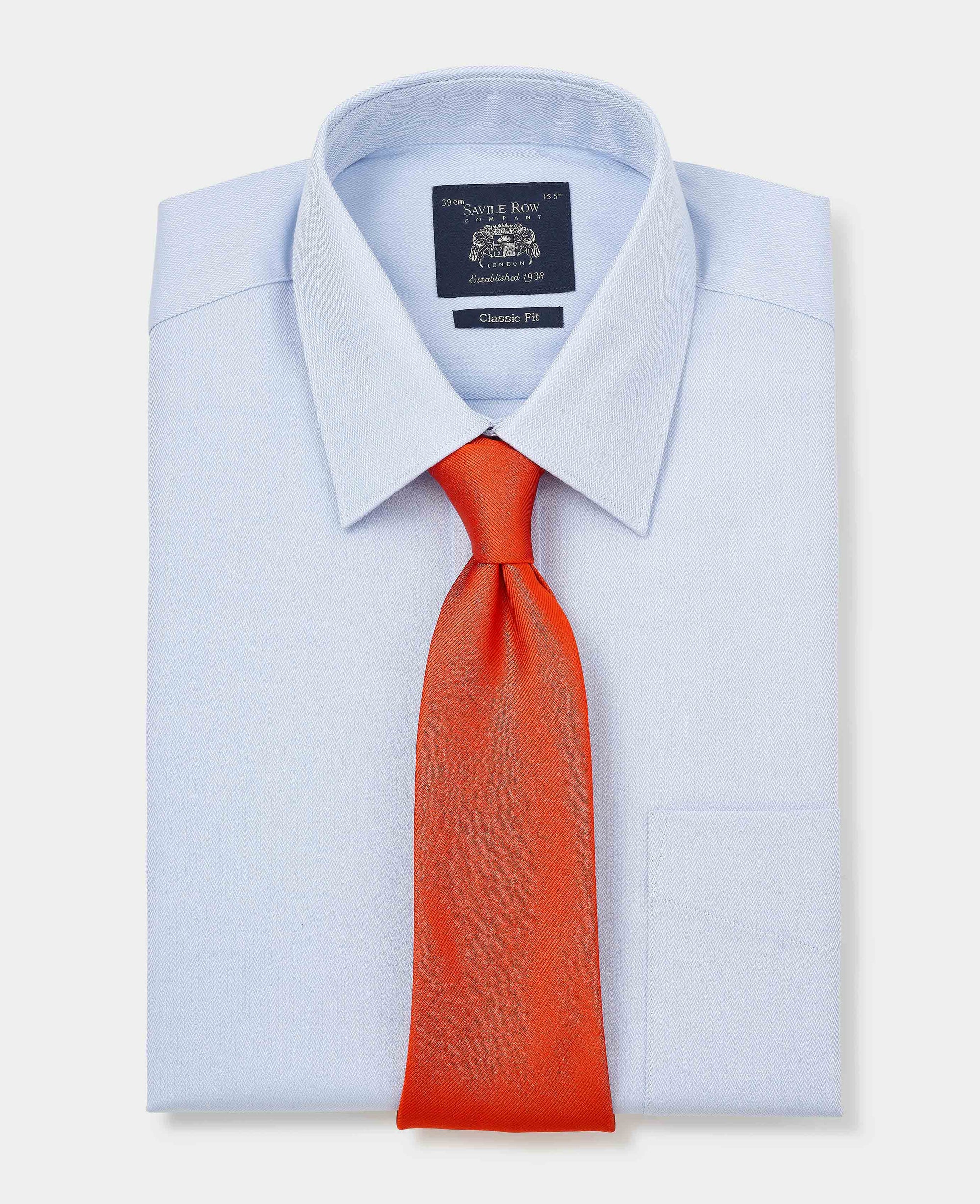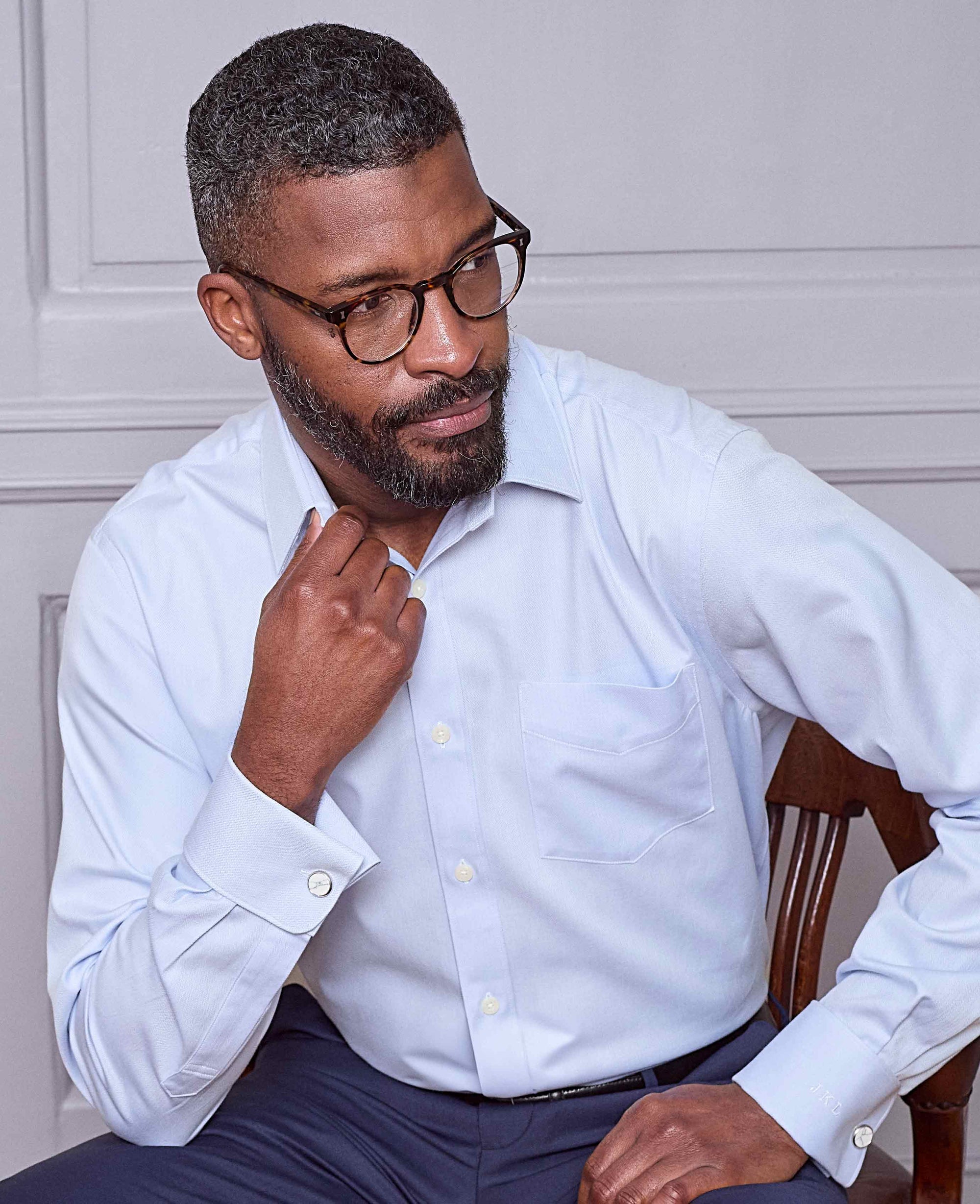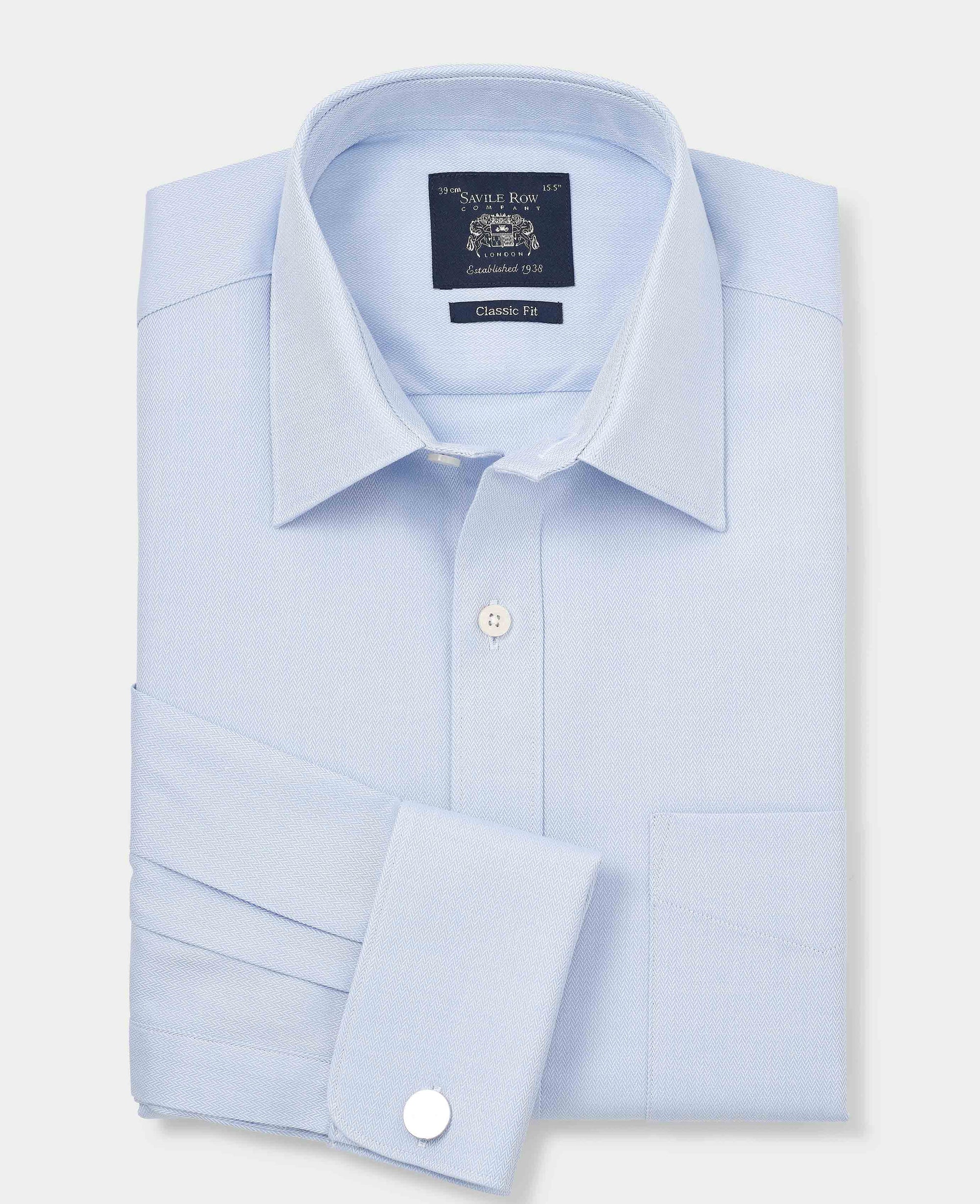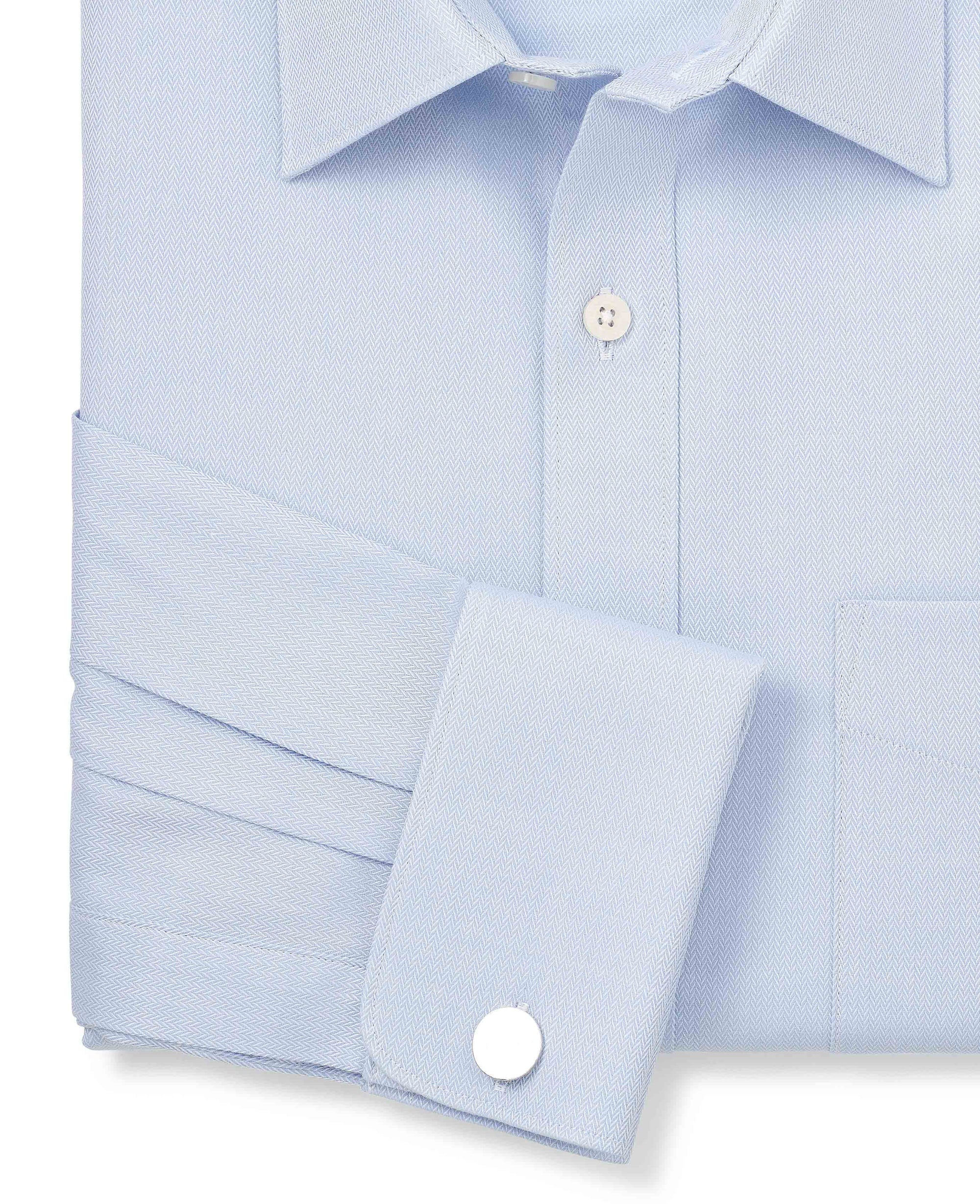 Crafted from premium textured cotton with a refined herringbone weave, this sky-blue dress shirt offers both sophistication and subtle depth. The breathable fabric ensures all-day comfort, while the herringbone pattern adds a touch of understated elegance. Designed in a classic fit for a roomy, relaxed feel, it features French cuffs for a polished look and a curl-resistant collar that maintains its sharp shape. Easy to iron for effortless maintenance, this shirt is a timeless wardrobe essential for the modern gentleman.