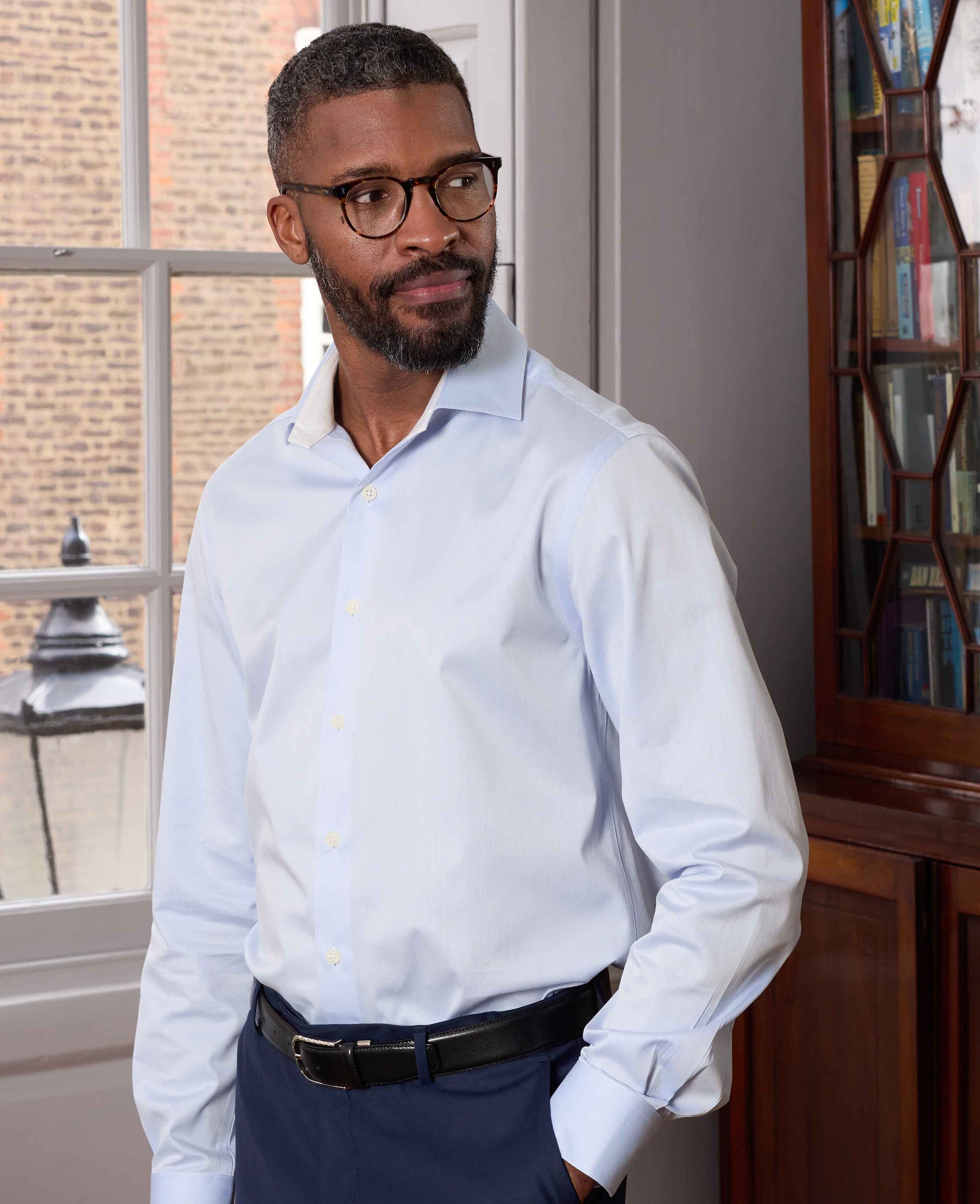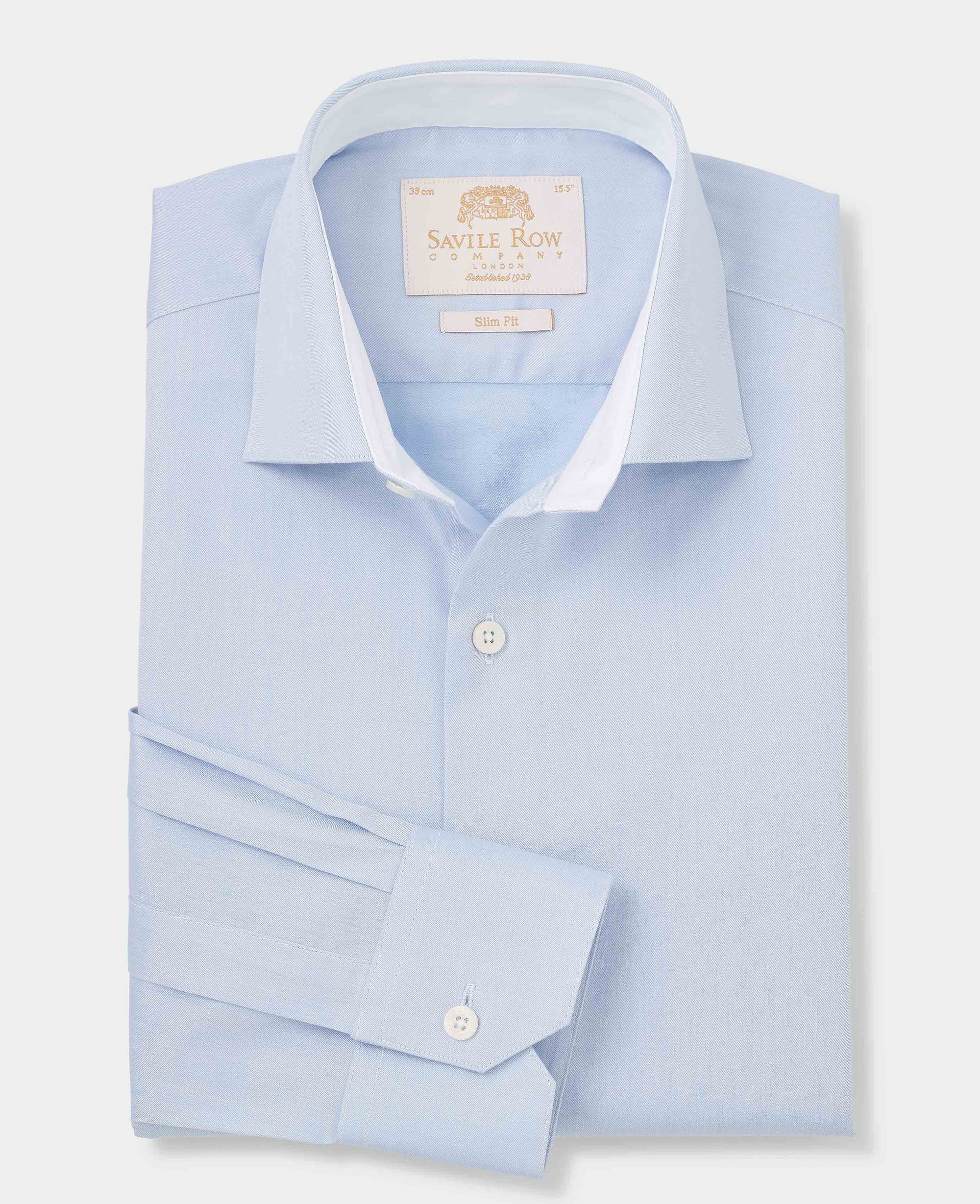 Refined, luxurious and expertly crafted, this sky blue slim-fit Dress shirt is a cut above the rest. Made from premium two-ply 80/2 super fine twill cotton, it offers exceptional softness, durability and a smooth, supple finish. The two-ply construction—where two yarns are twisted together before weaving—enhances strength and longevity while providing a silky, high-end feel. Designed for a sleek, flattering fit with a gently tapered shape, it features a curl-resistant cutaway collar with integral and removable stays, ensuring a crisp and structured look. Thoughtful details such as the clean French front placket, mitred single cuffs and pucker-free French taped seams add to its polished aesthetic. A split back yoke enhances movement and fit, making this an impeccable choice for those who appreciate the finer things in formalwear.