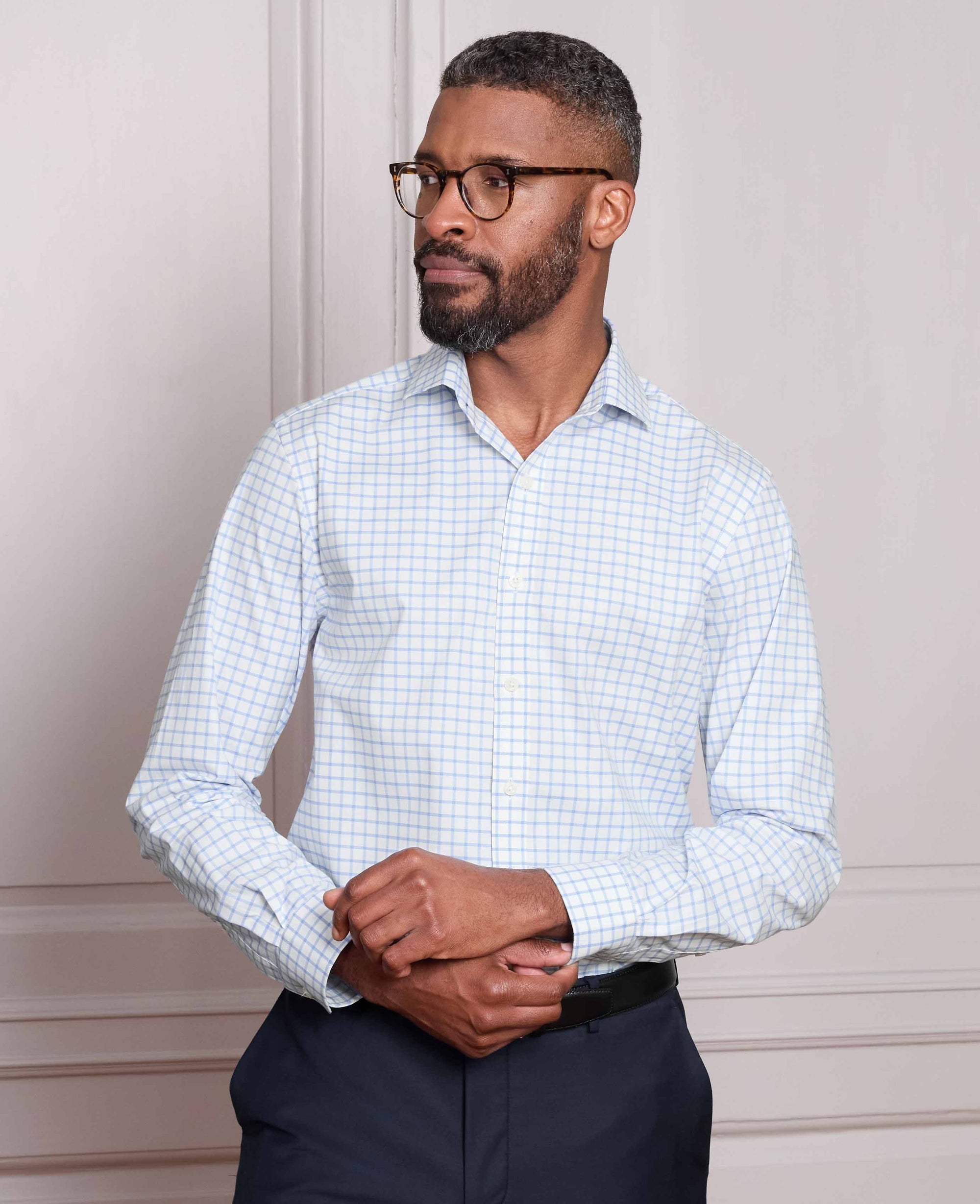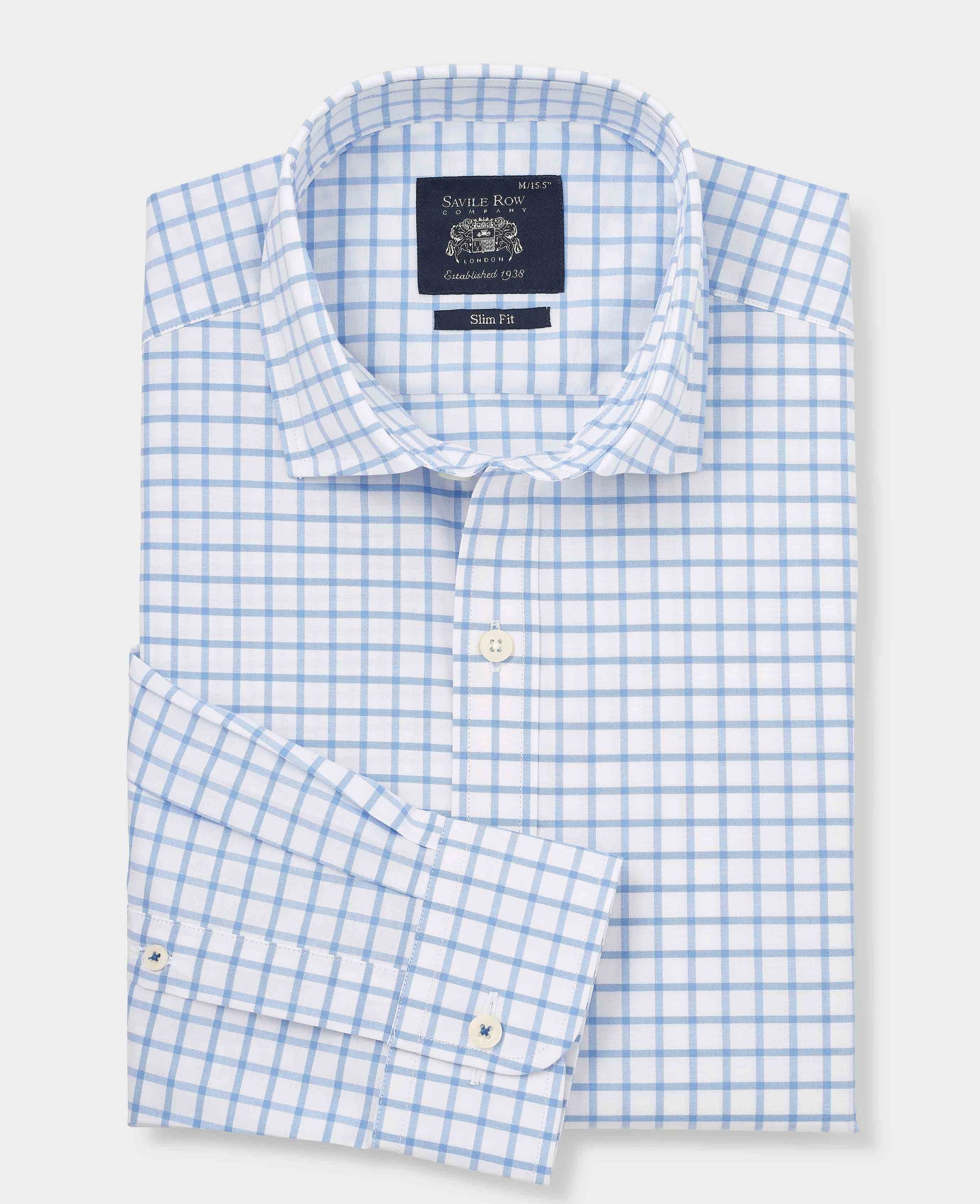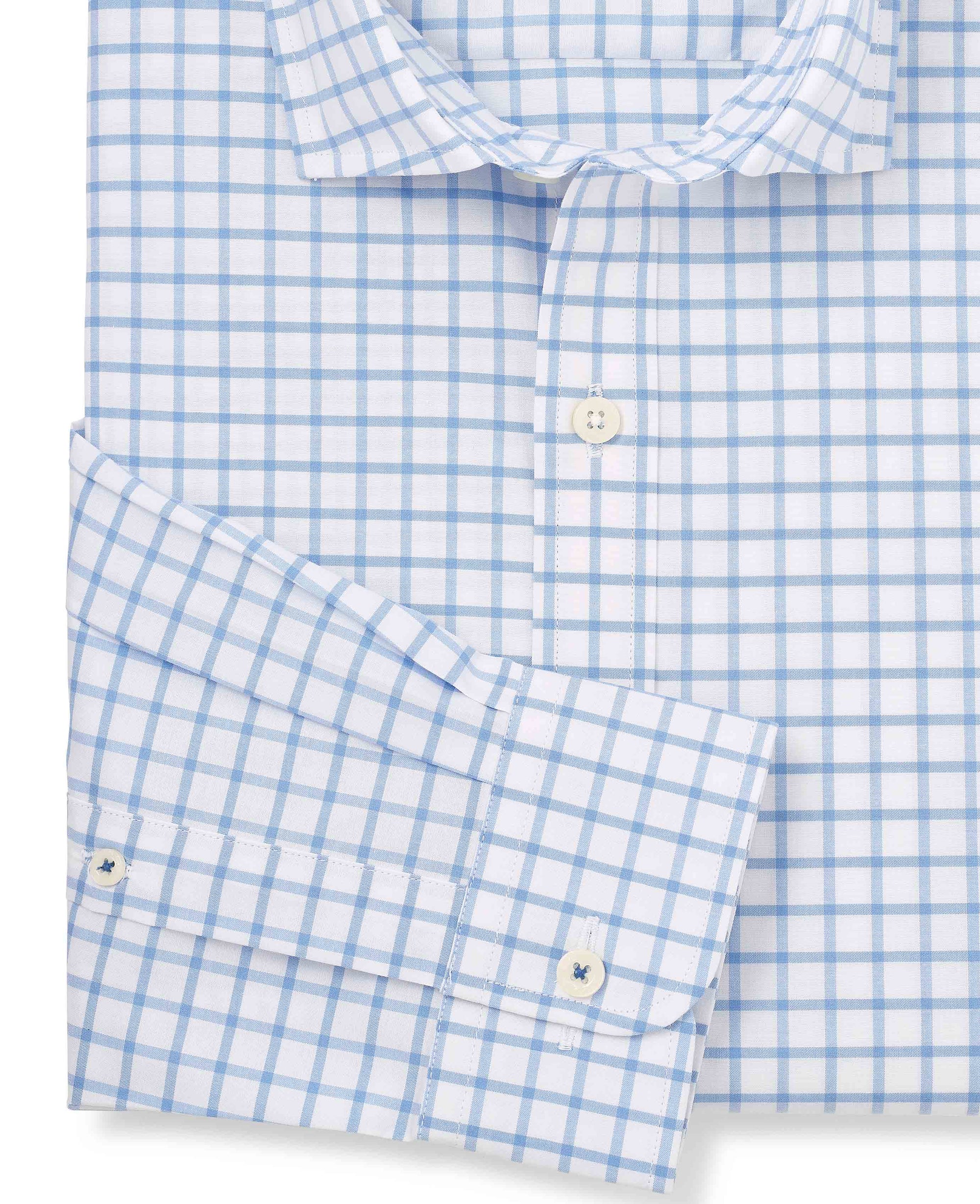 This men’s check smart-casual shirt brings together the best of both worlds: crisp enough to smarten up, relaxed enough to keep things easy. Made from breathable cotton with just a touch of stretch, it delivers all-day comfort and natural movement without losing its shape. The fabric feels smooth and cool against the skin, making it an ideal choice whether you’re dressing for the office or an off-duty occasion. Cut in a flattering slim fit, it’s gently tapered to suit all builds and slightly shorter in length, so it looks great both tucked in or worn loose. A small soft cutaway collar adds a refined edge, while the split yoke at the back ensures a better fit through the shoulders. Finished with subtle contrast blue thread on the neck and cuff buttons.